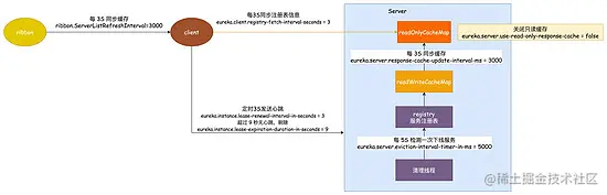 同步到只读缓存的时间修改为 3 秒一次:eureka.server.response-cache-update-interval-ms = 3000