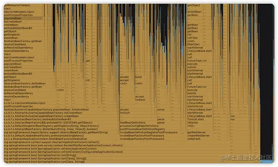 IDEA 自带集成了 async-profile 工具,所以我们可以通过火焰图来更直观的看到一些启动过程中的问题,比如下图例子当中,通过火焰图来看大量的耗时在 Bean 加载和初始化当中。