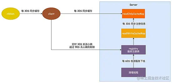 客户端和 Ribbon 负载均衡 都保持一个本地缓存,都是 30 秒定时同步。