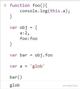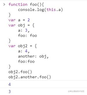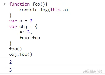 foo函数定义在obj外部,所以它其实并不属于obj,但是执行代码时,调用位置会使用obj的执行上下文,因此this就指向obj这个上下文对象了,所以obj.foo()打印出来的是3,是obj的a属性的值,而foo()是在全局下调用的,所以是全局下的a的值,foo()的调用放在这里只是为了作比较,让代码的作用和不同之处更直观的给读者看到。