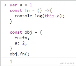 上述例子中fn是箭头函数,且定义在全局,所以它的this是指向全局Window的,所以即使是obj.fn()调用,this.a打印的也是1