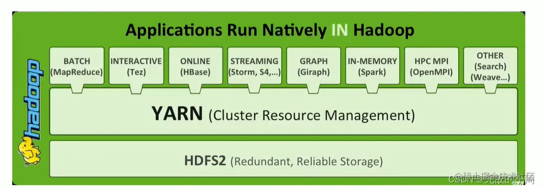 从图中可以看出,YARN不仅支持MapReduce,还支持其他很多框架,MapReduce已经淘汰了,但是Hadoop依然屹立不倒,正是因为YARN,YARN能支持各种框架来读取HDFS上的数据。