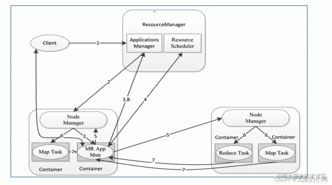 - 第七步:各个任务通过某个RPC协议向ApplicationMaster汇报自己的状态和进度,以让ApplicationMaster随时掌握各个任务的运行状态,从而可以在任务失败时重新启动任务。在应用程序运行过程中,用户可随时通过RPC向ApplicationMaster查询应用程序的当前运行状态。