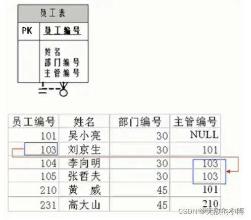 员工表中104,105的主管也是员工,主管编号就引用当前表中的员工编号。