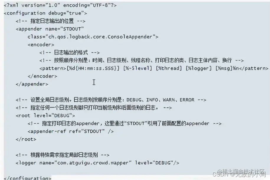 <?xml version="1.0" encoding="UTF-8" ?> <!DOCTYPE log4j:configuration SYSTEM "log4j.dtd"> <log4j:configuration xmlns:log4j="http://jakarta.apache.org/log4j/"> <appender name="STDOUT" class="org.apache.log4j.ConsoleAppender"> <param name="Encoding" value="UTF-8" /> <layout class="org.apache.log4j.PatternLayout"> <param name="ConversionPattern" value="%-5p %d{MM-dd HH:mm:ss,SSS} %m (%F:%L) \n" /> </layout> </appender> <logger name="java.sql"> <level value="debug" /> </logger> <logger name="org.apache.ibatis"> <level value="info" /> </logger> <root> <level value="debug" /> <appender-ref ref="STDOUT" /> </root> </log4j:configuration>