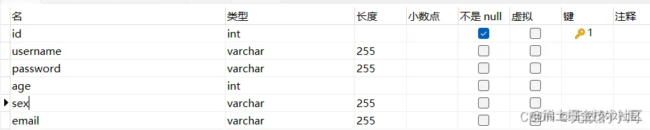 public class User { //保证属性名和字段名一致 private Integer id; private String username; private String password; private Integer age; private String sex; private String email; public User() { } public User(Integer id, String username, String password, Integer age, String sex, String email) { this.id = id; this.username = username; this.password = password; this.age = age; this.sex = sex; this.email = email; } public Integer getId() { return id; } public void setId(Integer id) { this.id = id; } public String getUsername() { return username; } public void setUsername(String username) { this.username = username; } public String getPassword() { return password; } public void setPassword(String password) { this.password = password; } public Integer getAge() { return age; } public void setAge(Integer age) { this.age = age; } public String getSex() { return sex; } public void setSex(String sex) { this.sex = sex; } public String getEmail() { return email; } public void setEmail(String email) { this.email = email; } @Override public String toString() { return "User{" + "id=" + id + ", username='" + username + ''' + ", password='" + password + ''' + ", age=" + age + ", sex='" + sex + ''' + ", email='" + email + ''' + '}'; } }