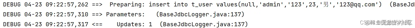 <!-- int insertUser();--> <insert id="insertUser"> insert into t_user values(null,'admin','123',23,'男','123@qq.com') </insert>