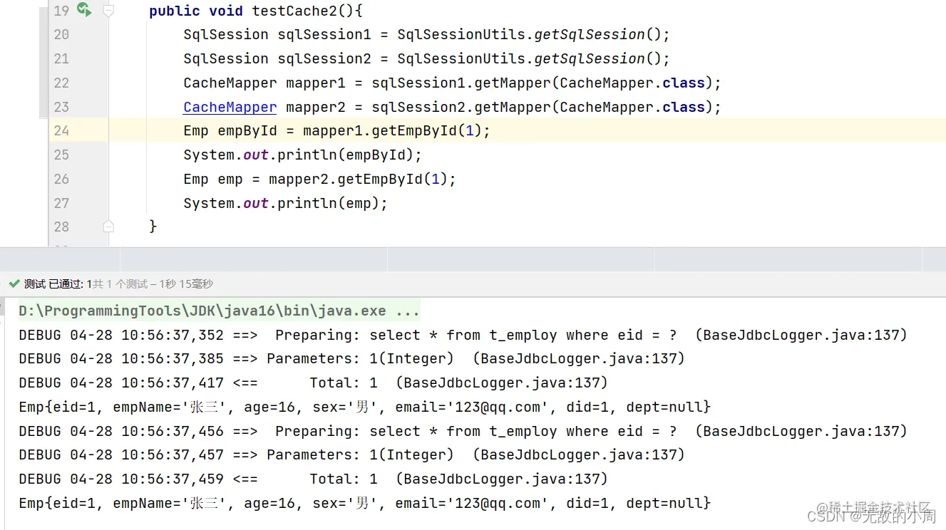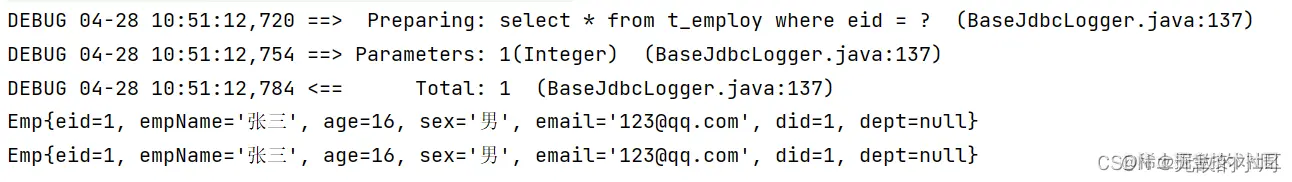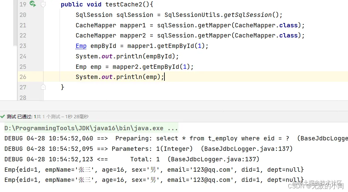 观察执行的sql,第二个语句没有执行sql说明是从缓存中拿到的数据