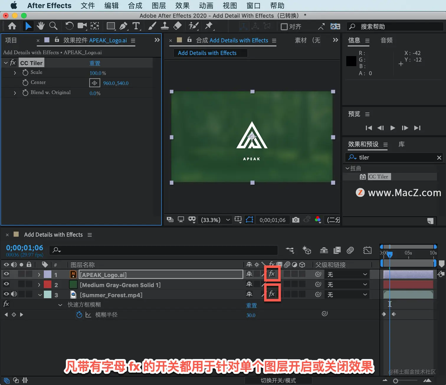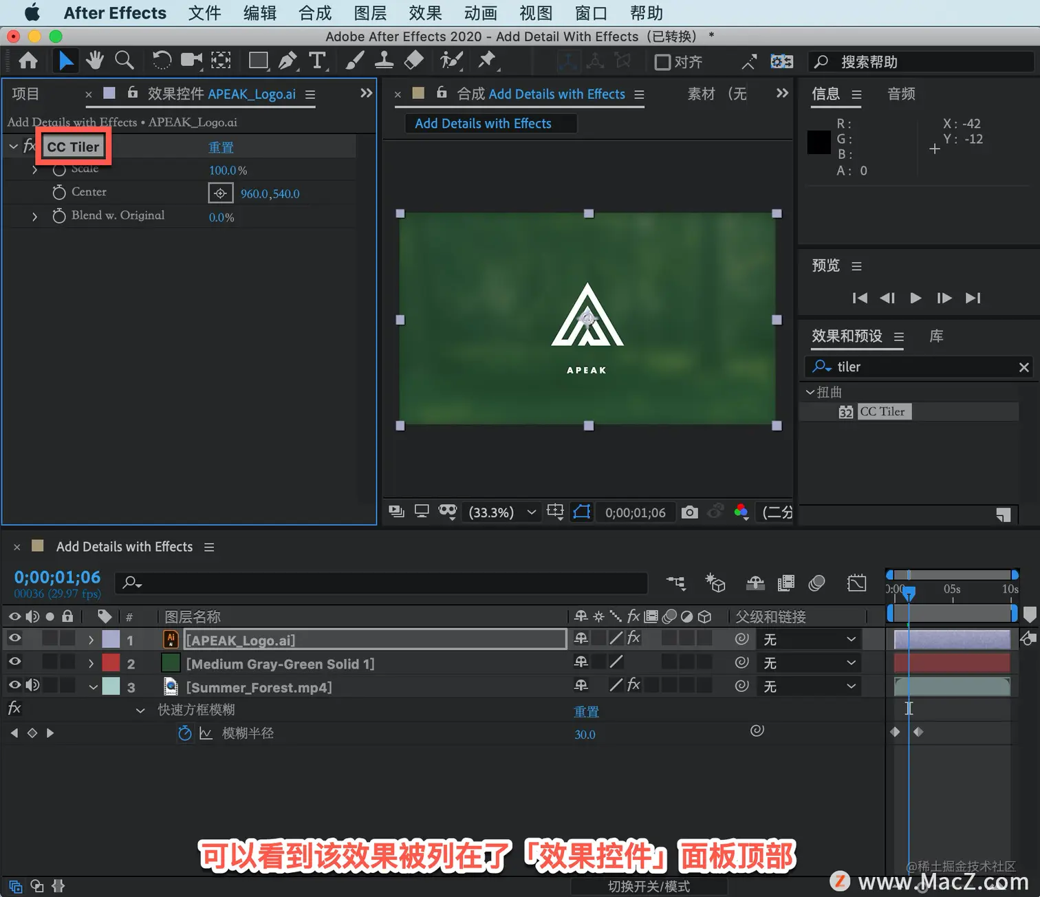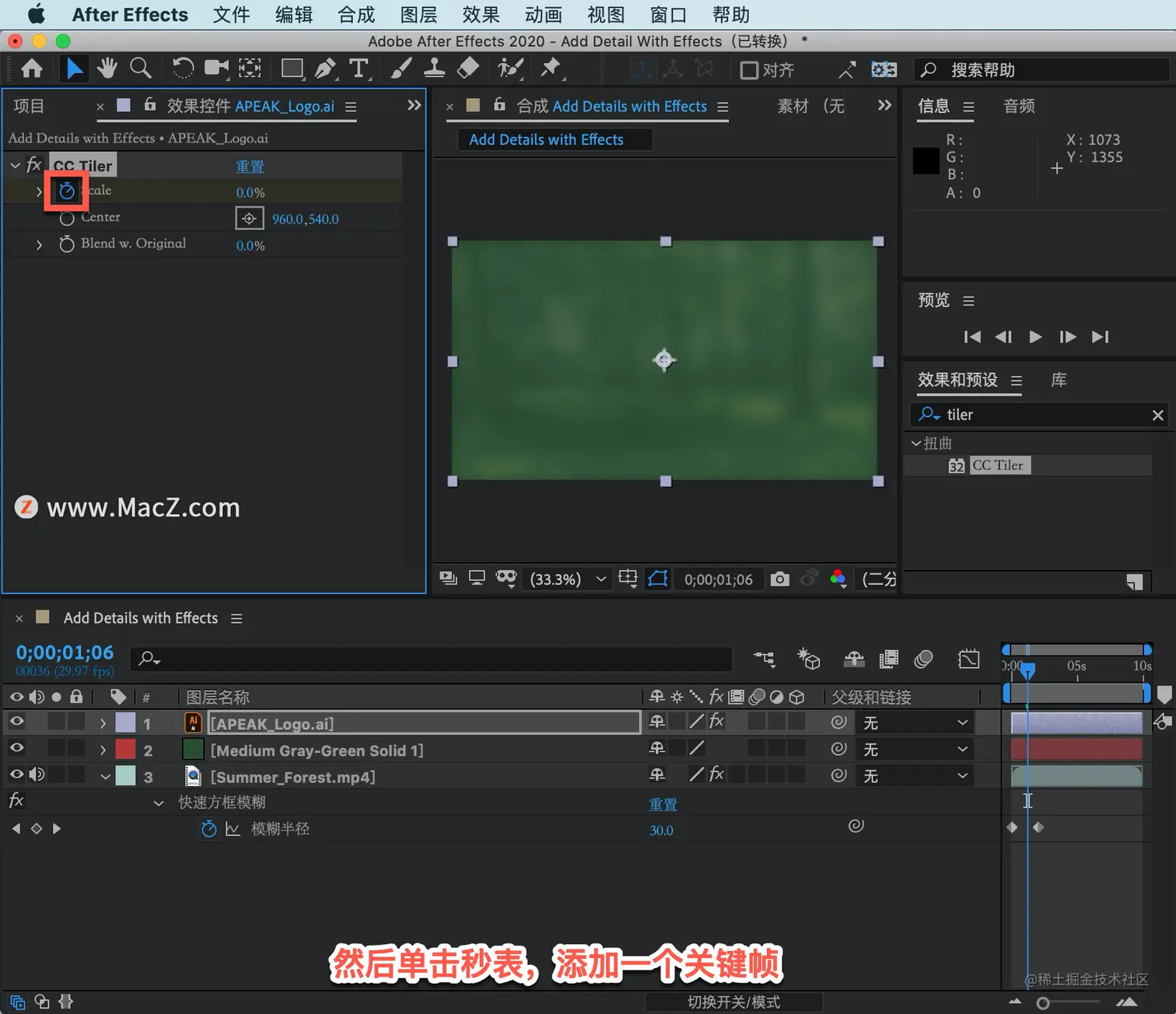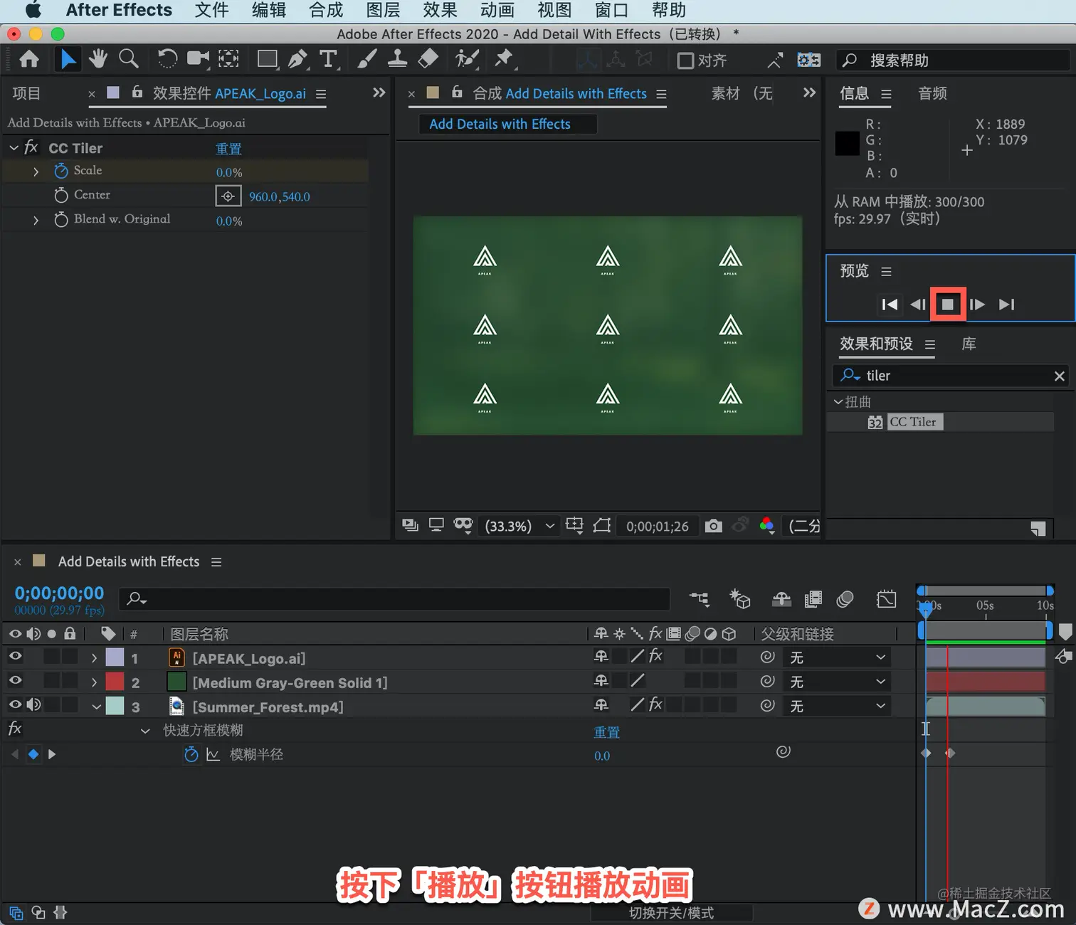 以上就是在 After Effects 中应用平铺效果的方法。