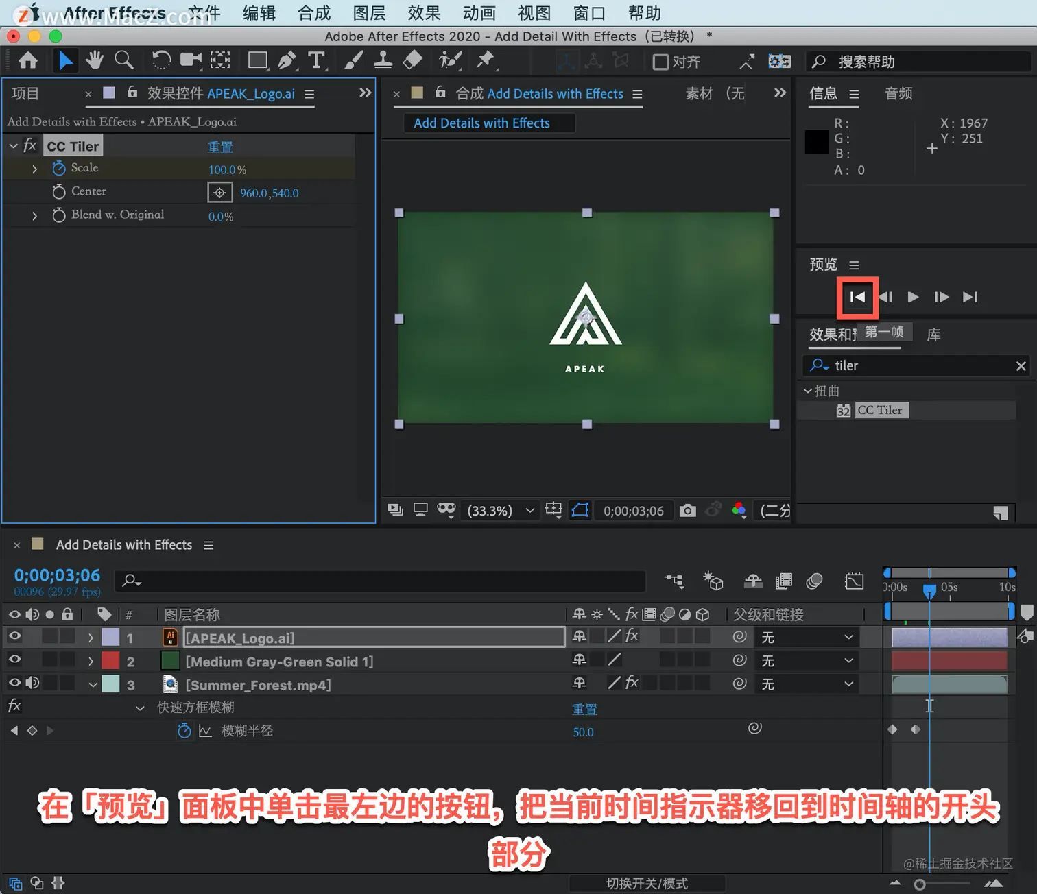 要预览动画,可以在「预览」面板中单击最左边的按钮,把当前时间指示器移回到时间轴的开头部分。