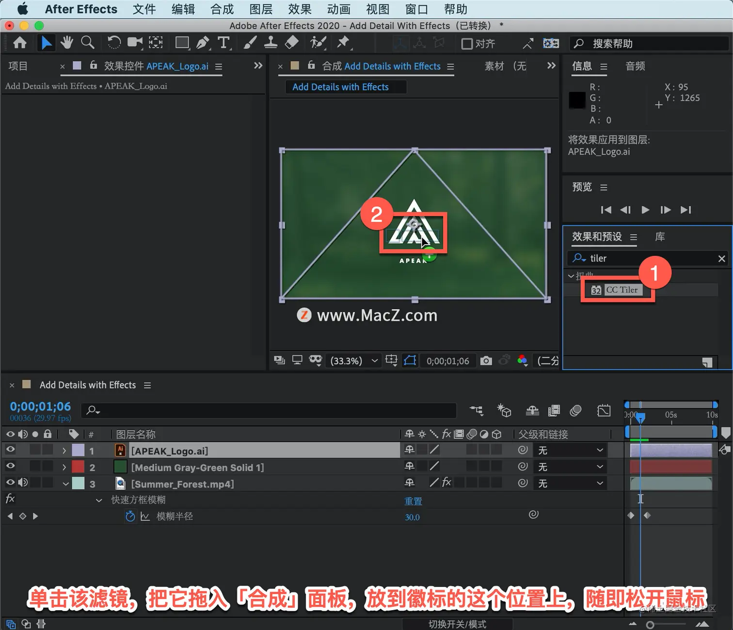 单击该滤镜,把它拖入「合成」面板,放到徽标的这个位置上,随即松开鼠标。