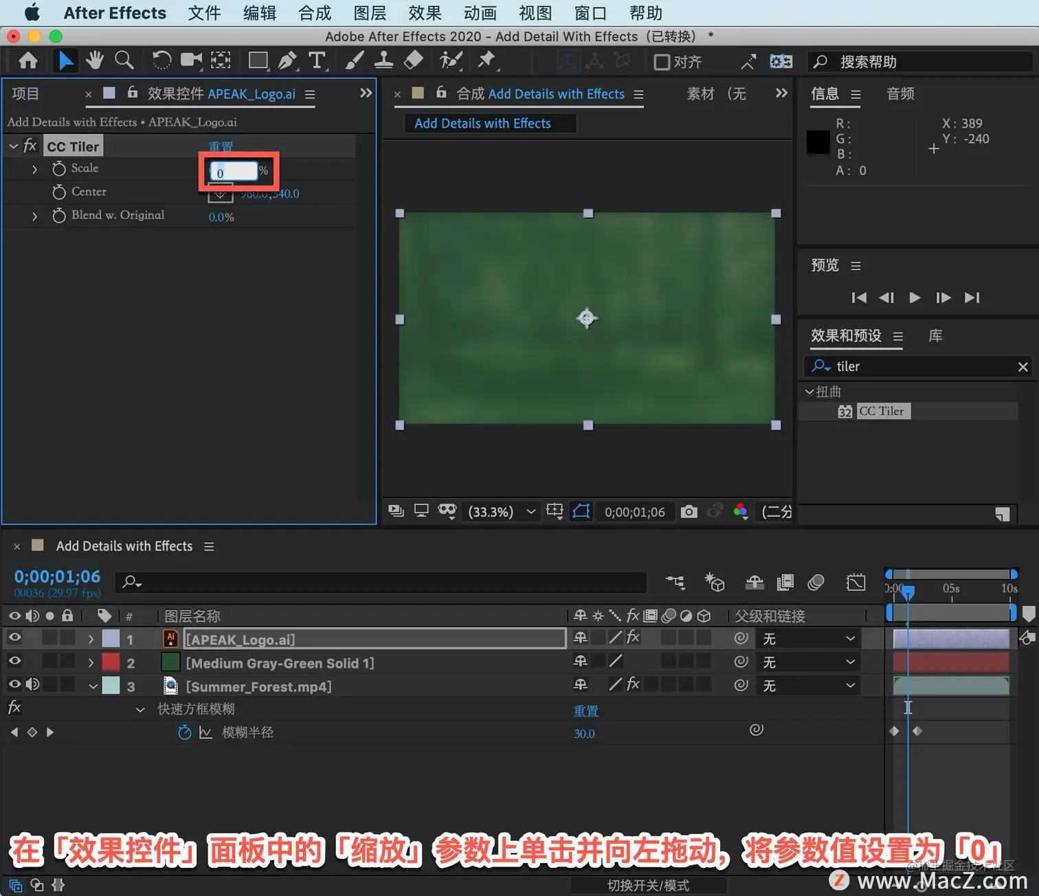 在「效果控件」面板中的「缩放」参数上单击并向左拖动,将参数值设置为「0」。