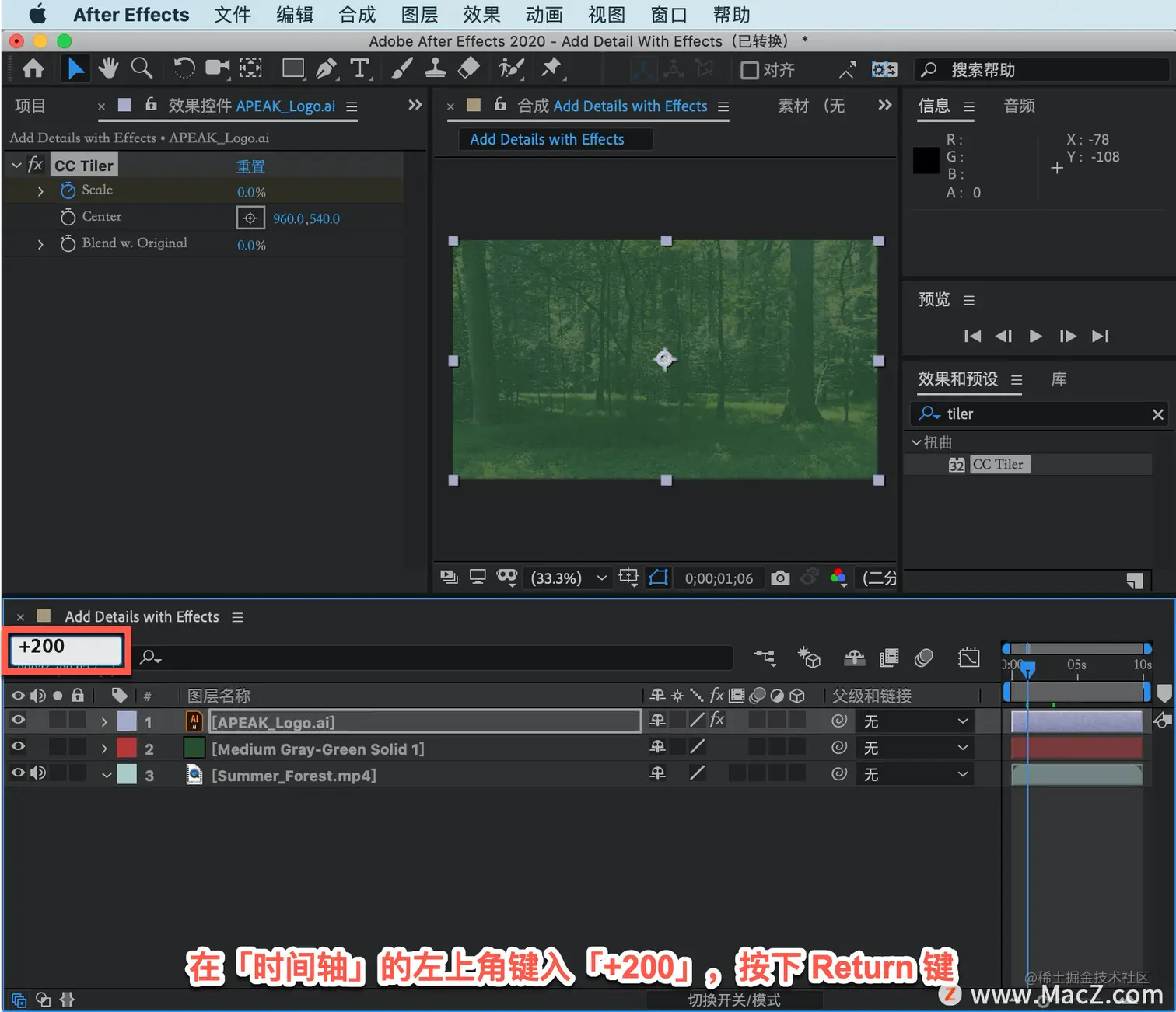 沿时间轴下移大约 2 秒,在「时间轴」的左上角键入「+200」,按下 Return 键。