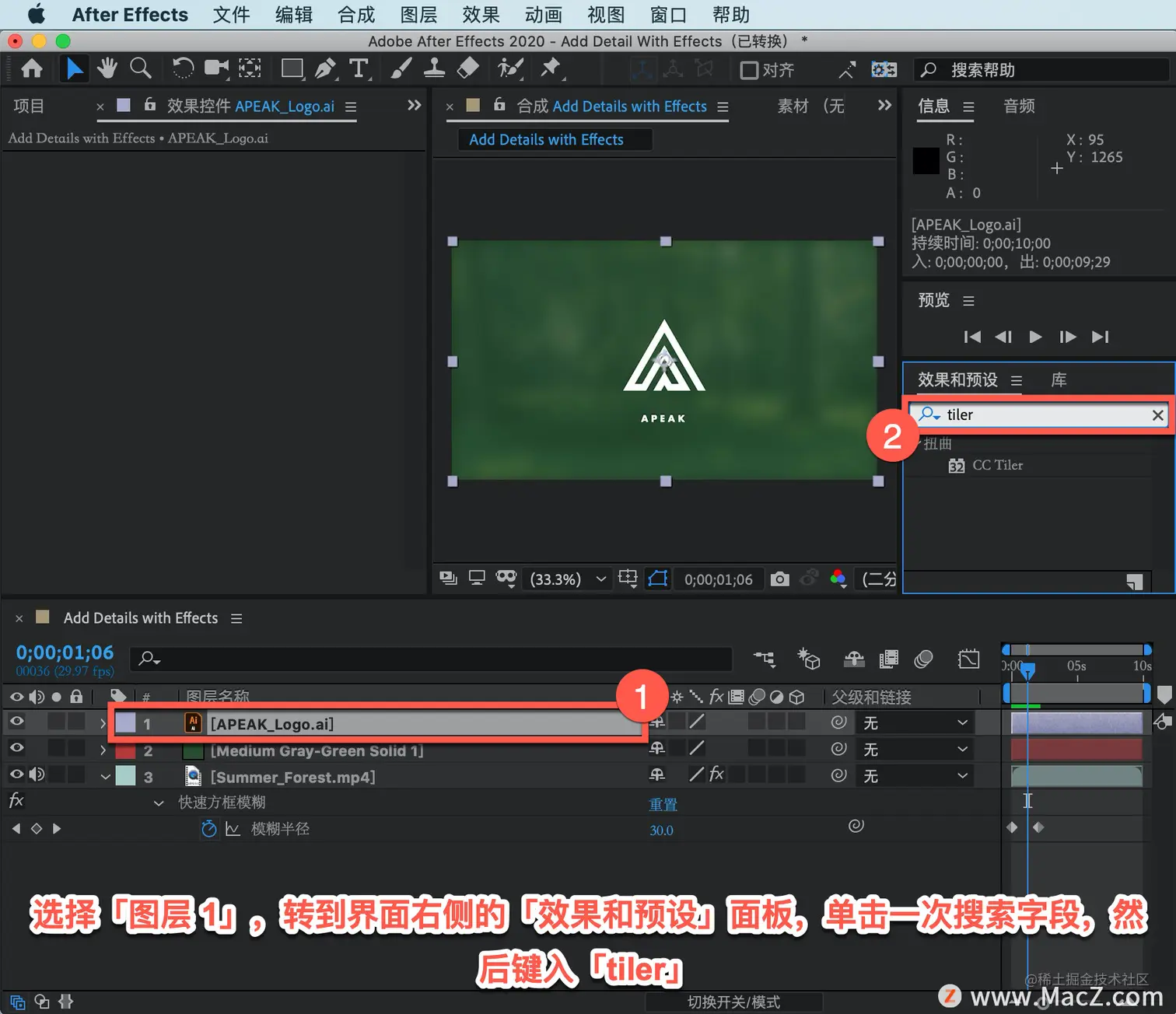 选择「图层 1」,转到界面右侧的「效果和预设」面板,单击一次搜索字段,然后键入「tiler」,随即弹出扭曲滤镜「CC Tiler 」。