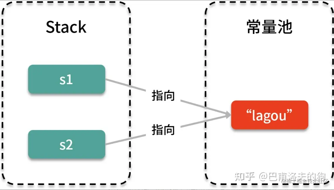 其实 s1 和 s2 背后指向的都是常量池中的同一个“lagou”,如下图所示: