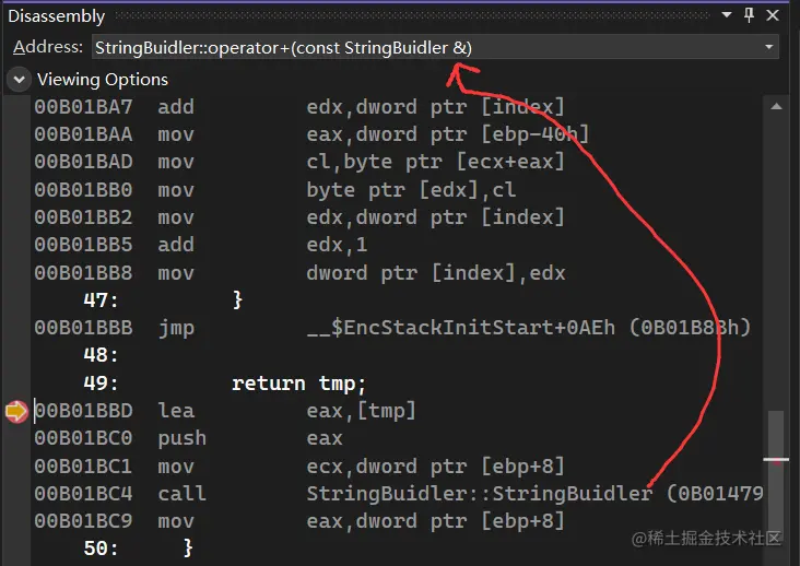 从这个例子中可以看到,s1+s2 操作中出现了一次 深copy,具体代码出现在 return 处,汇编代码如下: