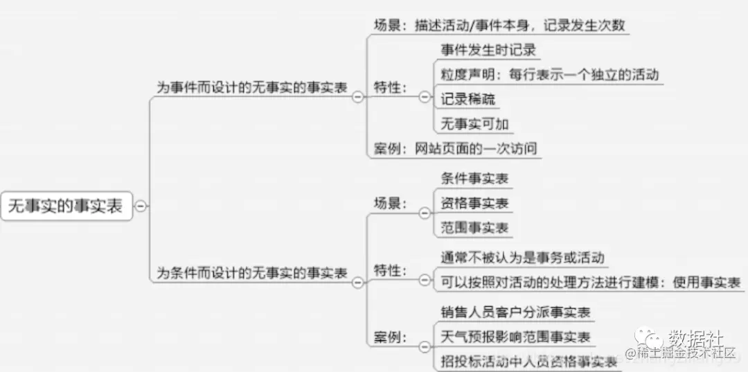 在维度模型中,事实表用事实来度量业务过程,不包含事实或度量的事实表称为无事实的事实表。虽然没有明确的事实,但可以用来支持业务过程的度量。常见的无事实的事实表主要有如下两种:
