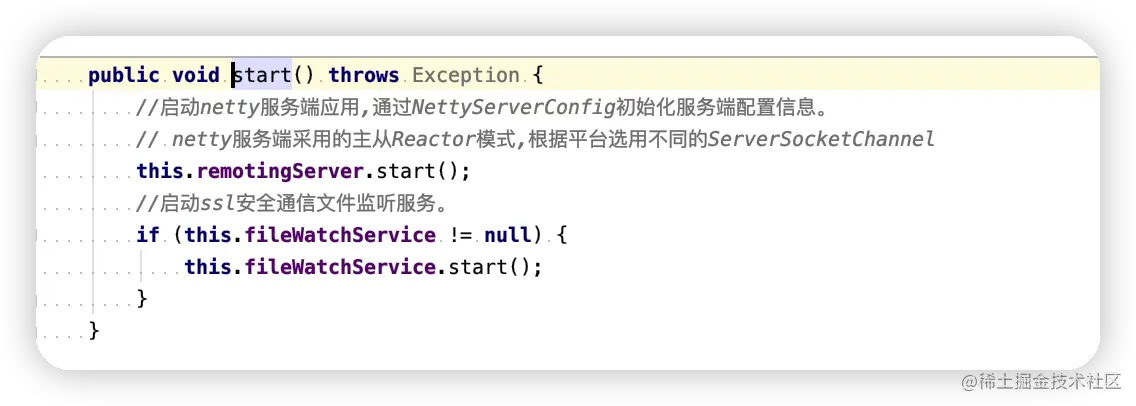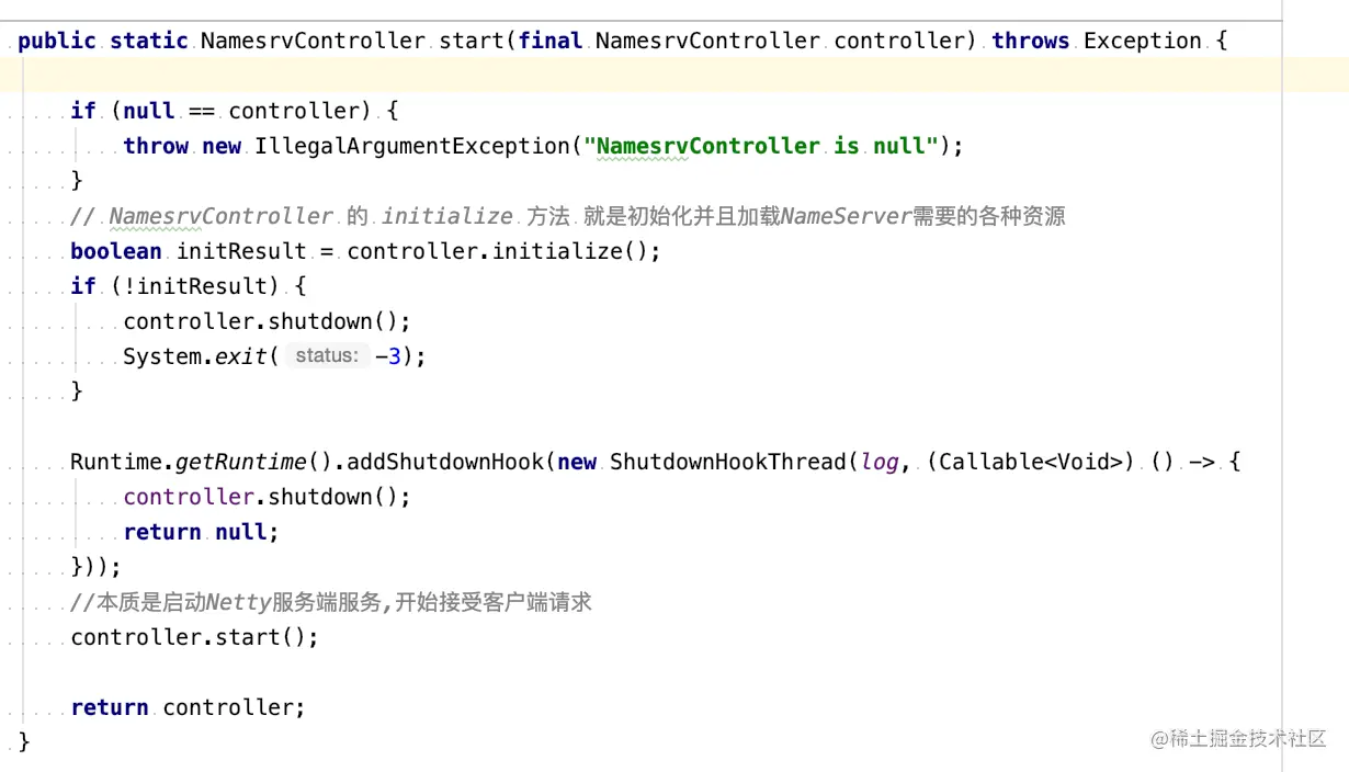 接下来,调用start方法,初始化并且启动NameServer服务