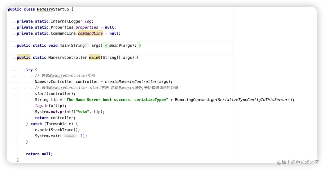 NameServer服务的启动的入口类-NamesrvStartup,启动NamerServer的命令行脚本 bin/mqnamesrv 调用的就是这个类文件。