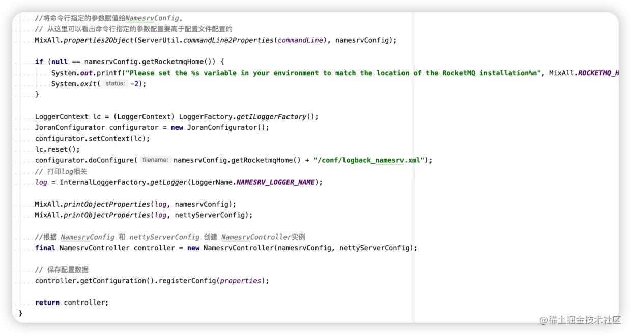 至此,createNamesrvController方法执行完毕,这个方法主要是加载命令行配置,构建nameSrvConfig和nettyServerConfig,然后以此作为构建参数创建NamesrvController对象