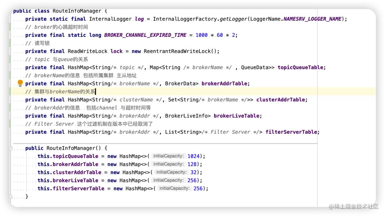 RouteInfoManager这个类主要围绕着 brokerLiveTable clusterAddrTable brokerAddrTable topicQueueTable来展开