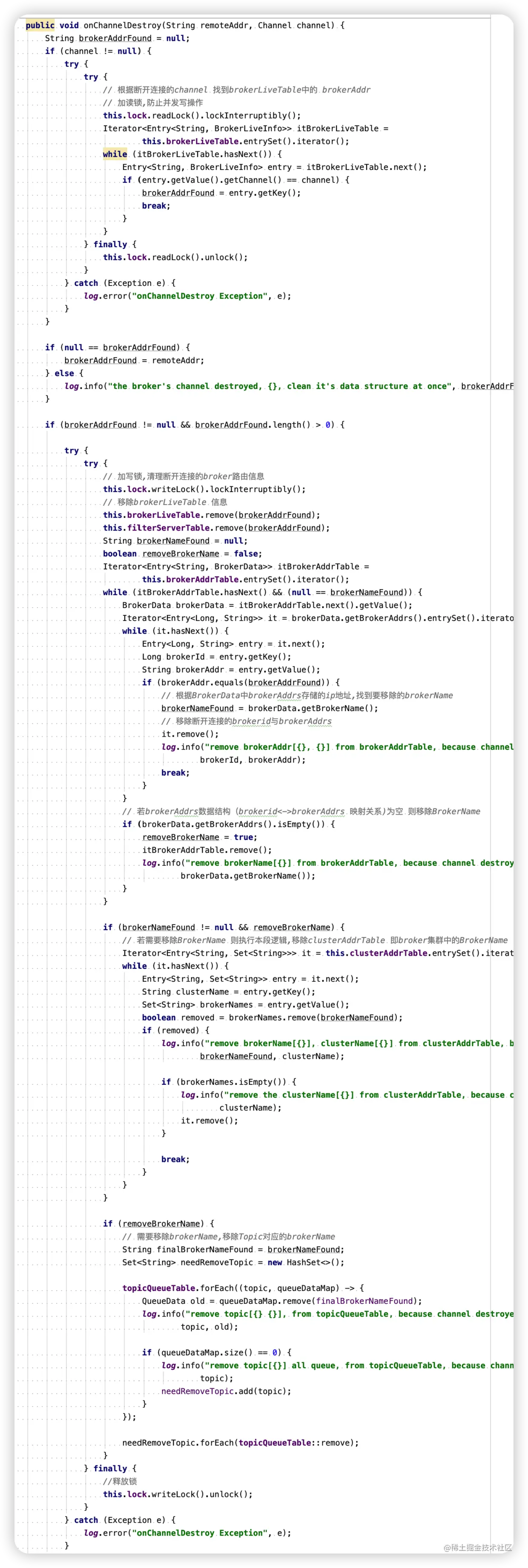 处理的内容也是当broker断开连接或者心跳超时,回调RouteInfoManage的onChannelDestroy方法