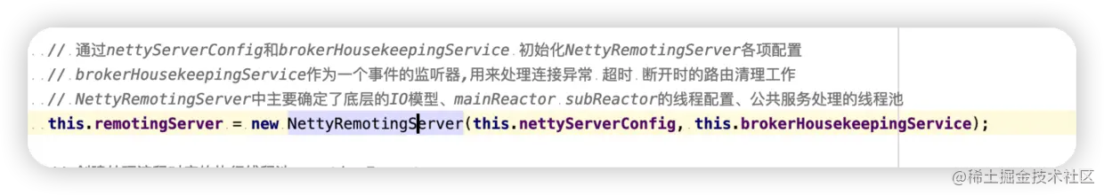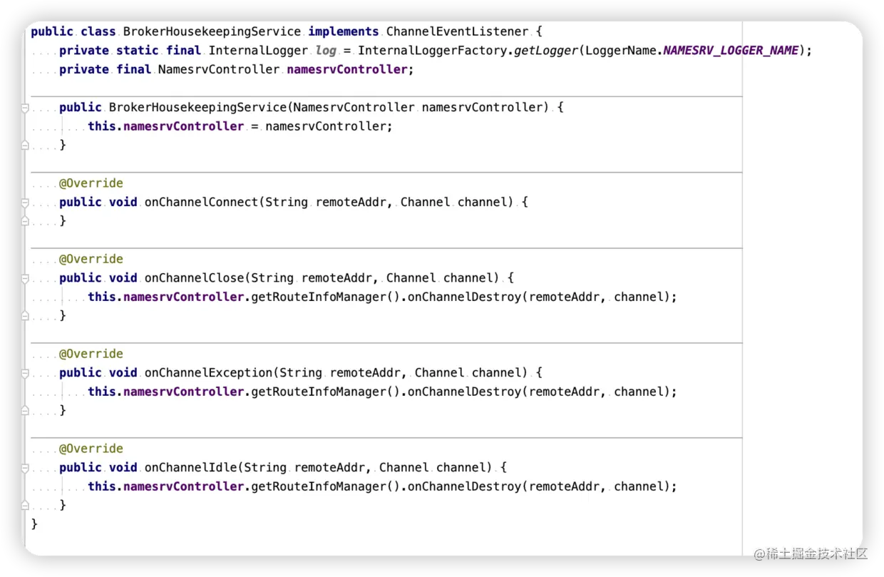 上面介绍完DefaultRequestProcessor 接下来讲一下BrokerHousekeepingService,这个类在构造remotingServer也即是Netty服务的时候作为构造参数传入