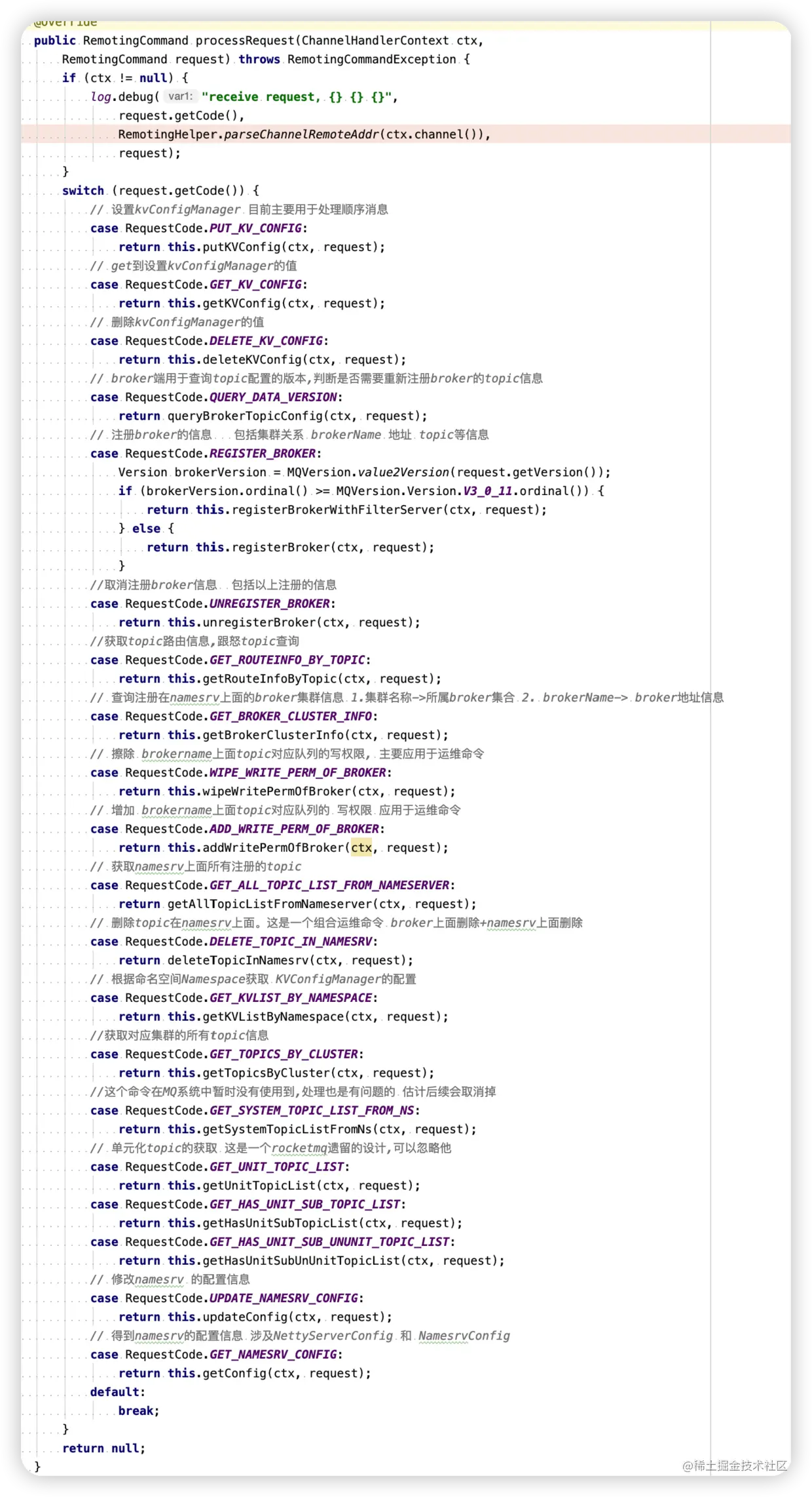 processRequest是DefaultRequestProcessor执行请求处理的方法,不同的请求Code对应不同的业务处理方法