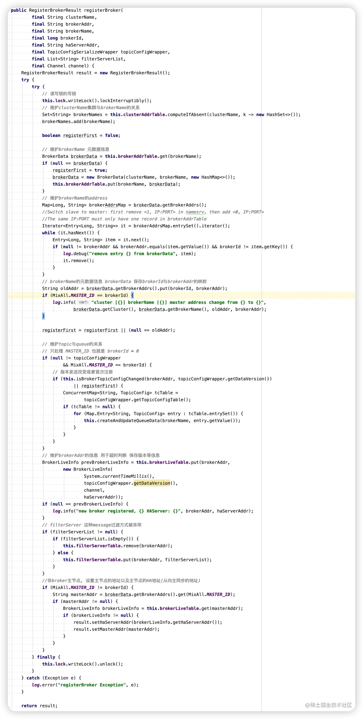 经过以上的代码内容可以看到,broker的注册,也是围绕着RouteInfoManager类中的几个属性来处理的