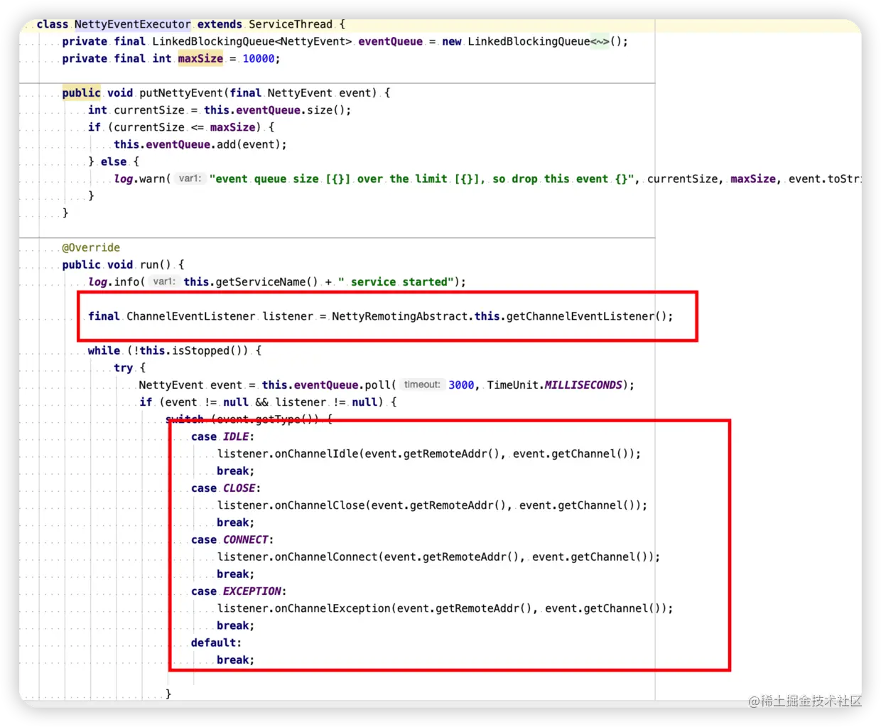 NettyEventExecutor服务线程来处理事件队列中的事件,红框中标示拿到的listener就是BrokerHousekeepingService,根据不同的事件处理进行能不同的处理