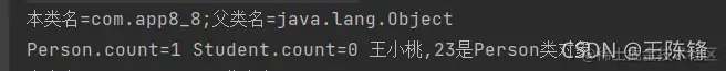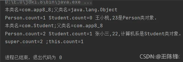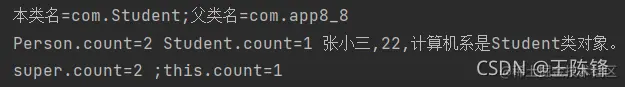 public class app8_8 {//定义app8_8类 static int count = 0;//定义静态变量count protected String name; protected int age; public app8_8(String n1, int a1)//构造方法 { name = n1; age = a1; this.count++;//调用父类的静态变量 } public String toString() { return this.name + "," + this.age; } public void display() { System.out.print("本类名=" + this.getClass().getName() + ";"); System.out.println("父类名=" + this.getClass().getSuperclass().getName()); System.out.print("Person.count=" + this.count + " "); System.out.print("Student.count=" + Student.count + " "); Object obj = this; if (obj instanceof Student)//判断对象属于哪个类 System.out.println(obj.toString() + "是Student类对象。"); else if (obj instanceof app8_8) System.out.println(obj.toString() + "是Person类对象."); } } class Student extends app8_8//子类Student继承自父类app8_8,且是主类但不是public类 { static int count=0;//隐藏了父类的count protected String dept; protected Student(String n1,int a1,String d1) { super(n1,a1);//调用父类的构造方法 dept=d1; this.count++;//调用子类的静态变量 } public String toString()//覆盖父类的同名方法 { return super.toString()+","+dept;//调用父类的同名方法 } public void display() { super.display();;//调用父类的方法 System.out.print("super.count="+super.count);//引用父类的变量 System.out.println(" ;this.count="+this.count); } public static void main(String[] args) { app8_8 per=new app8_8("王小桃",23); per.display(); Student stu=new Student("张小三",22,"计算机系"); stu.display(); } }