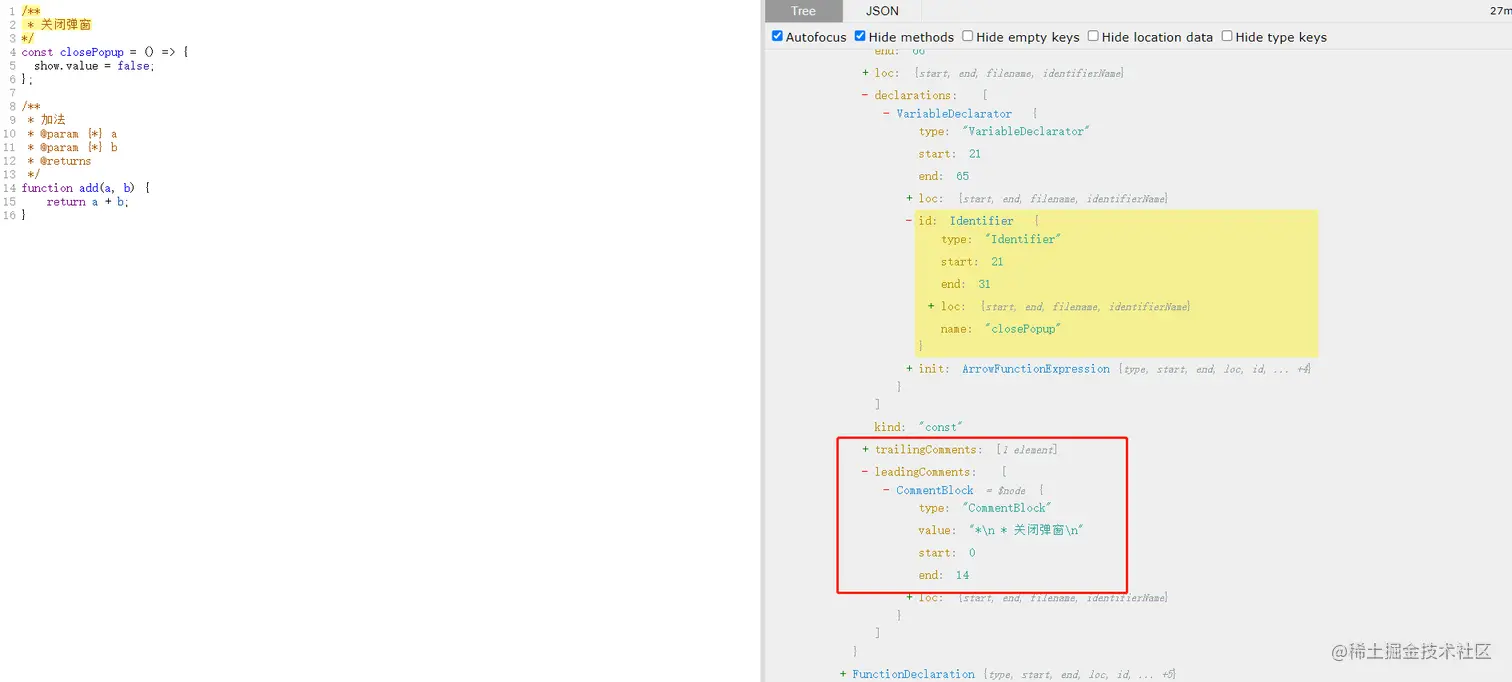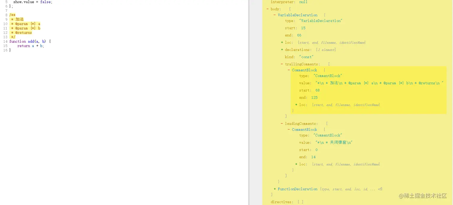 leadingComments字段代表的是前面的注释,trailingComments后面的注释,所以我们可以通过去查找对应节点leadingComments数组内type类似是CommentBlock 的对象是否存在,来判断是否存在注释,也可以提取value值然后生成方法的文档