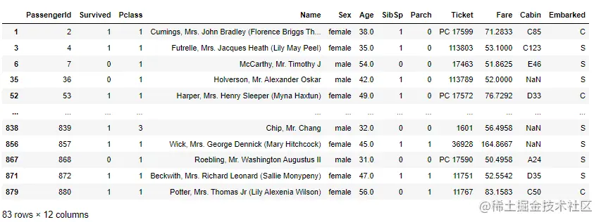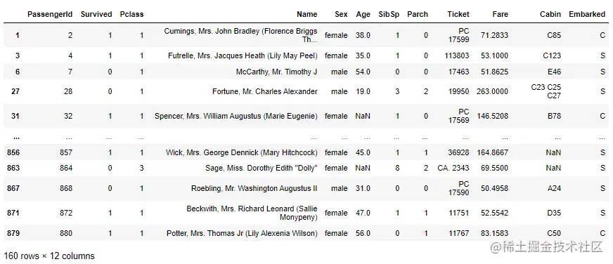 还可以使用 and、or 和 not 运算符比较多个列,以下语句检索 Fare 大于 50 和 Age 大于 30 的所有行: