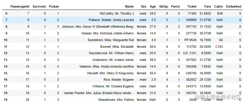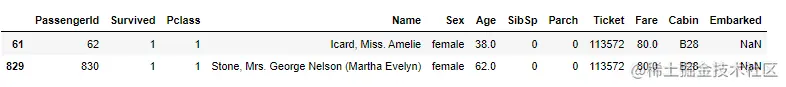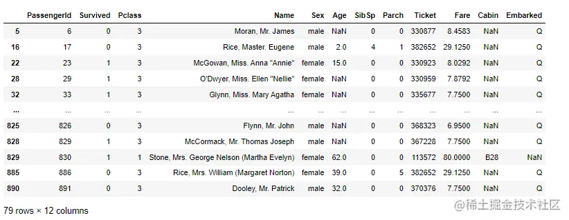 以下输出显示了从皇后镇 (‘Q’) 出发的乘客以及缺失值的乘客: