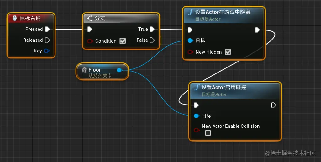 UE4-关于场景中隐藏了物体,鼠标射线检测获取物体时依然会点击 Nicander 2022-07-25 645 阅读1分钟 问题描述 UE中通过获取鼠标命中结果 这个蓝图节点获取鼠标命中结果,但物体隐藏后,点击物体所在的位置依然可以获取鼠标命中结果? 原因及解决办法 是因为碰撞检测的问题,虽然物体隐藏了,但获取鼠标命中结果 这个蓝图节点是通过射线检测获取的,物体隐藏后依然能够检测到,需要在物体隐藏的同时关闭物体碰撞检测。