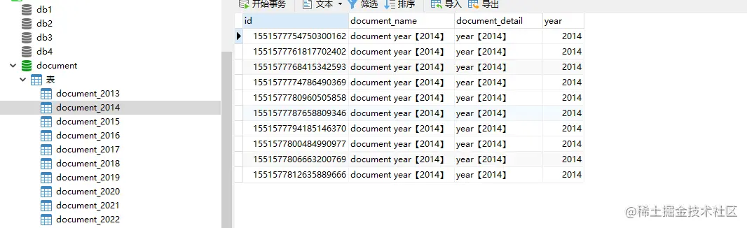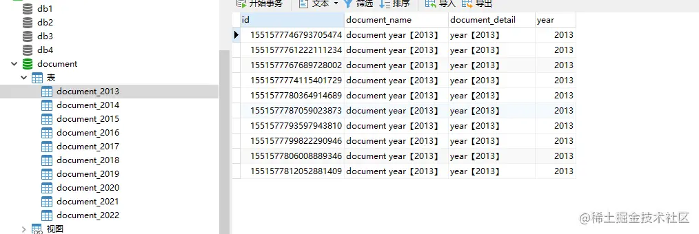 下面的document_前缀的表进行分片,如document_2022,document_2021,{2013..2022}代表2013到2022这个区间,sharding-column是分片列,