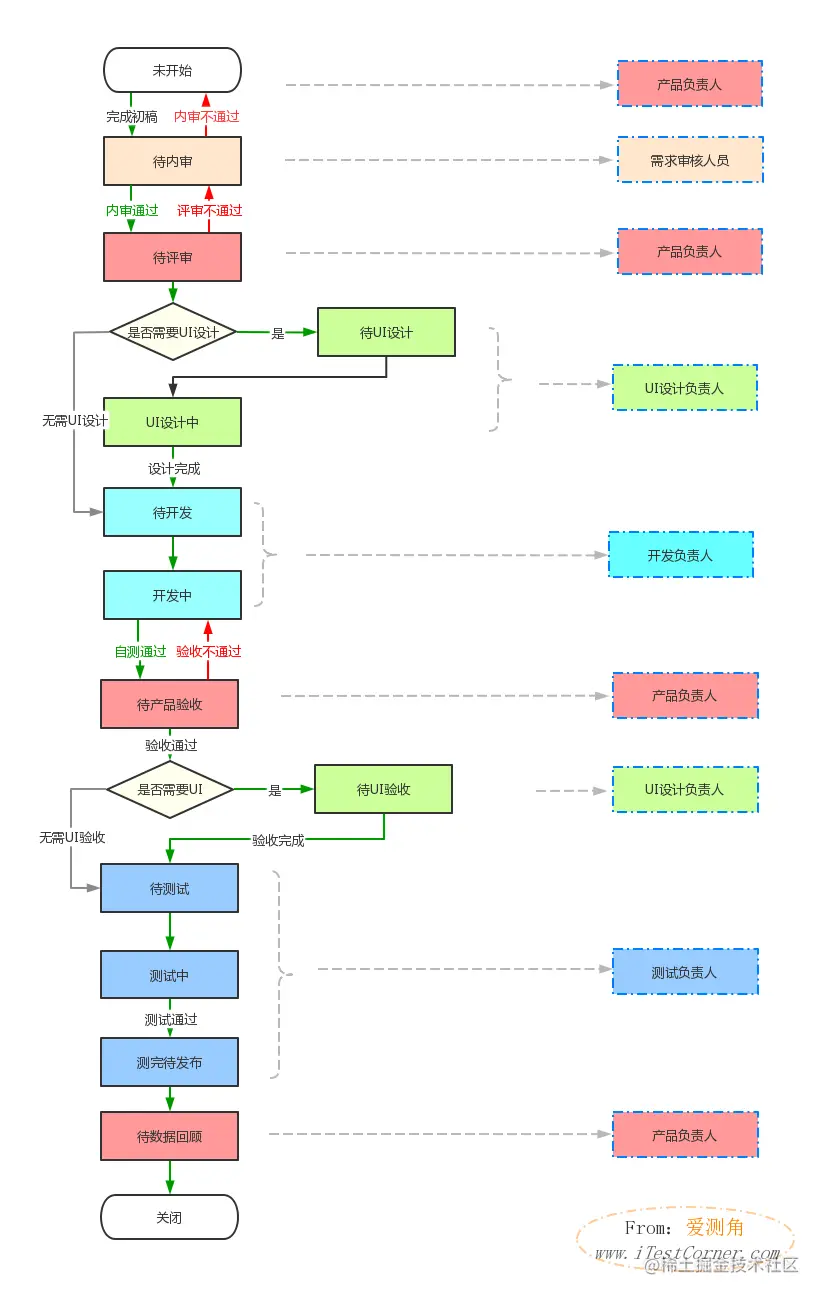 初版的协作流程如图1-1所示,整个流程涉及了产品人员、UI设计人员、测试人员、开发人员和项目管理员五种角色,并设计了未开始、待内审、待评审、待UI设计、UI设计中、待开发、开发中、待产品验收、待测试、测试中、测完待发布、待数据回顾、关闭共13个项目节点,每个节点关联一个角色负责人。