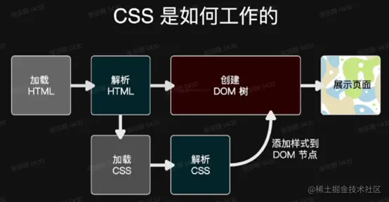打开页面后,浏览器会加载HTML,并对其进行解析获得树形结构(DOM树)。通过外链、嵌入和内联加载并解析CSS,获取树上每一个节点对应的CSS样式从而得到渲染树,将DOM节点渲染出对应的样式,最终获得一个具体的页面。