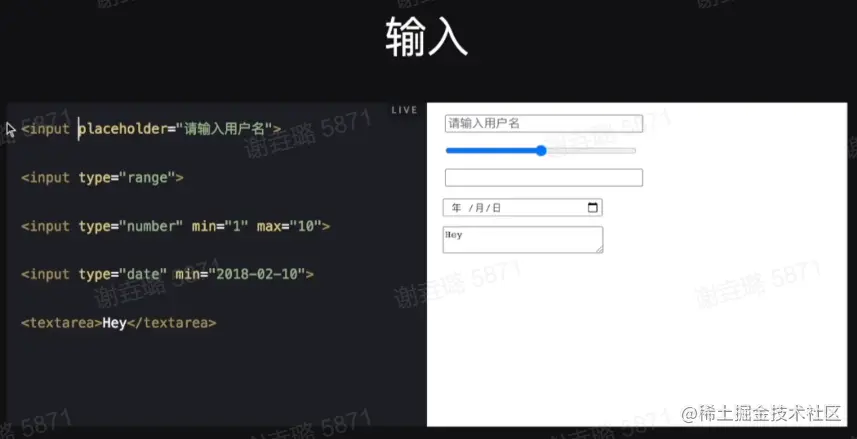 input文本输入框,placeholder表示占位符:用户没有输入时,自动显示什么,用户输入时就取消掉了<input type="range">用户输入范围,在用户输入数据时下方会显示一个滑动酷爱,表示数据输入的长度<input type="number" min="1" max="10">让用户输入数字,指定最小值和最大值<input type="date" min="2018-02-10">取日期相关的值,日期选择,弹出日期选择框<textarea>Hey</textarea>需要用户输入多行的长文字