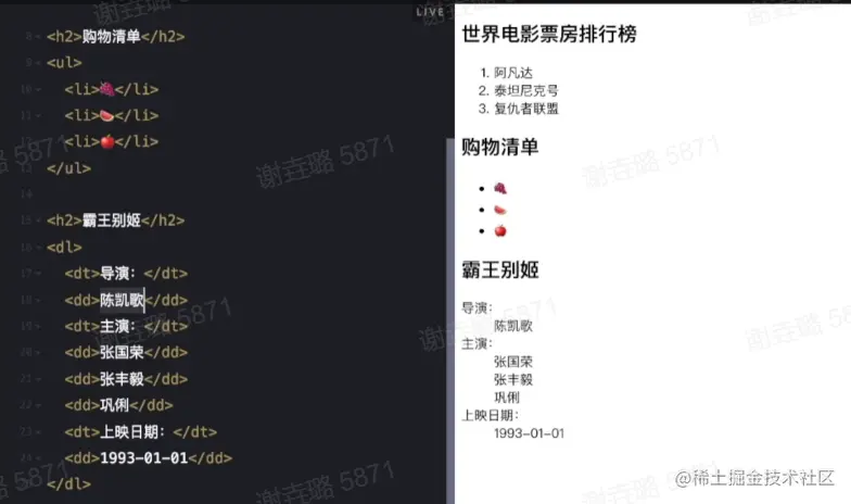 - 定义列表:dl 有属性名的列表,dt:描述列表里的标题,具体的值用dd表示
