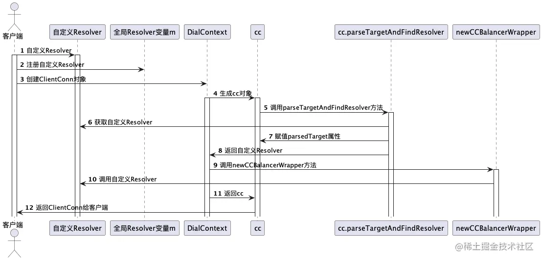 在了解了客户端调用发起的流程后,我们重点看下 ClientConn 方法,该方法巨长,只看我们关注的Resolver部分。ClientConn 第二个参数 Target 的语法可以参考 github.com/grpc/grpc/b… ,采用了URI的格式,其中第一部分表示Resolver的名称,即自定义Builder方法Scheme的返回值。格式如下:
