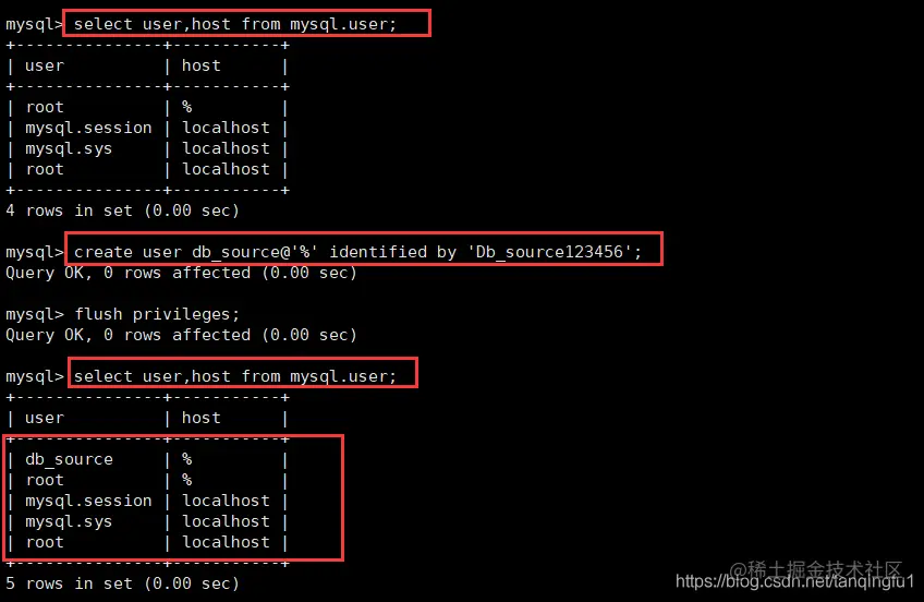 可以创建用户:create user db_source@'%' identified by 'Test123456';