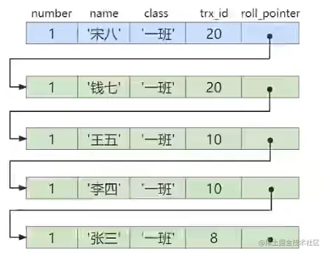 每次对记录的改动都会生成一条UNDO日志,每条日志也有也有roll_point属性,这些UNDO日志连起来构成了版本链,头结点是最新的版本。