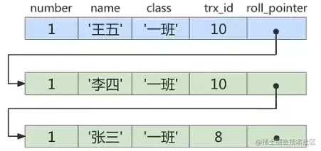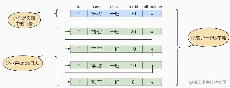 trx_id:每次一个事务对行数据进行改动时,把该事务的事务id赋给这条记录的trx_id字段roll_point:每次事务对行数据进行改动时,会把旧的版本写入UNDO日志中,roll_point指针指向该日志,用来找到之前的版本信息