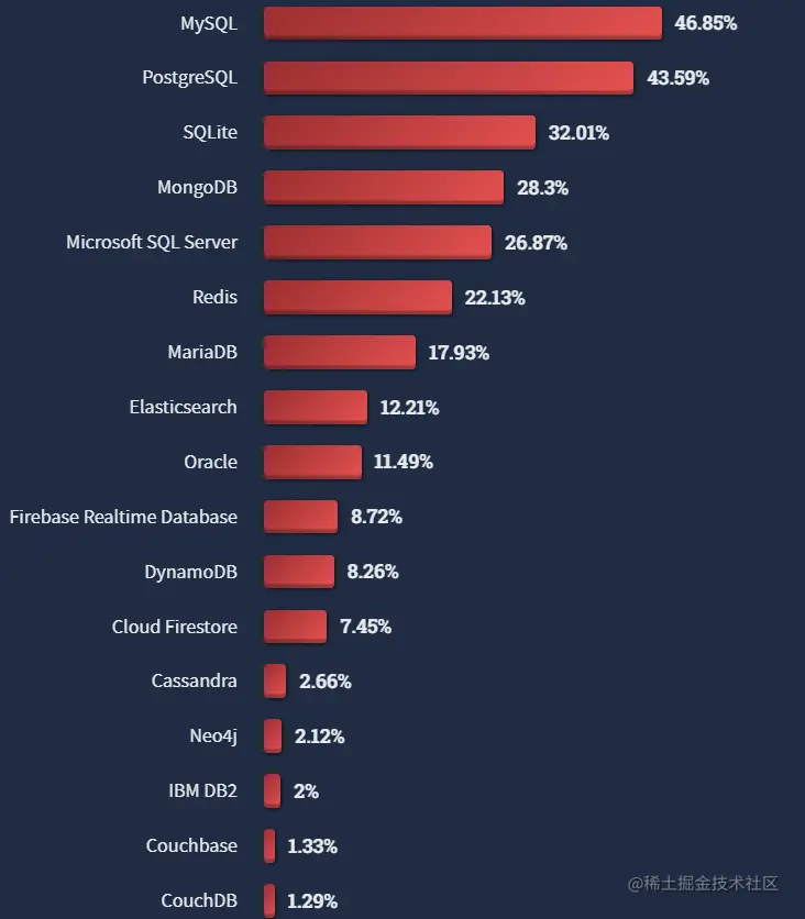 StackOverflow 2022 开发者报告:总体而言,MySQL 依然是最受欢迎的的数据库。但在专业开发者群体中,PostgreSQL(46.48%)已经超越 MySQL(45.68%)夺得了第一名。看来必须得学一波了啊。