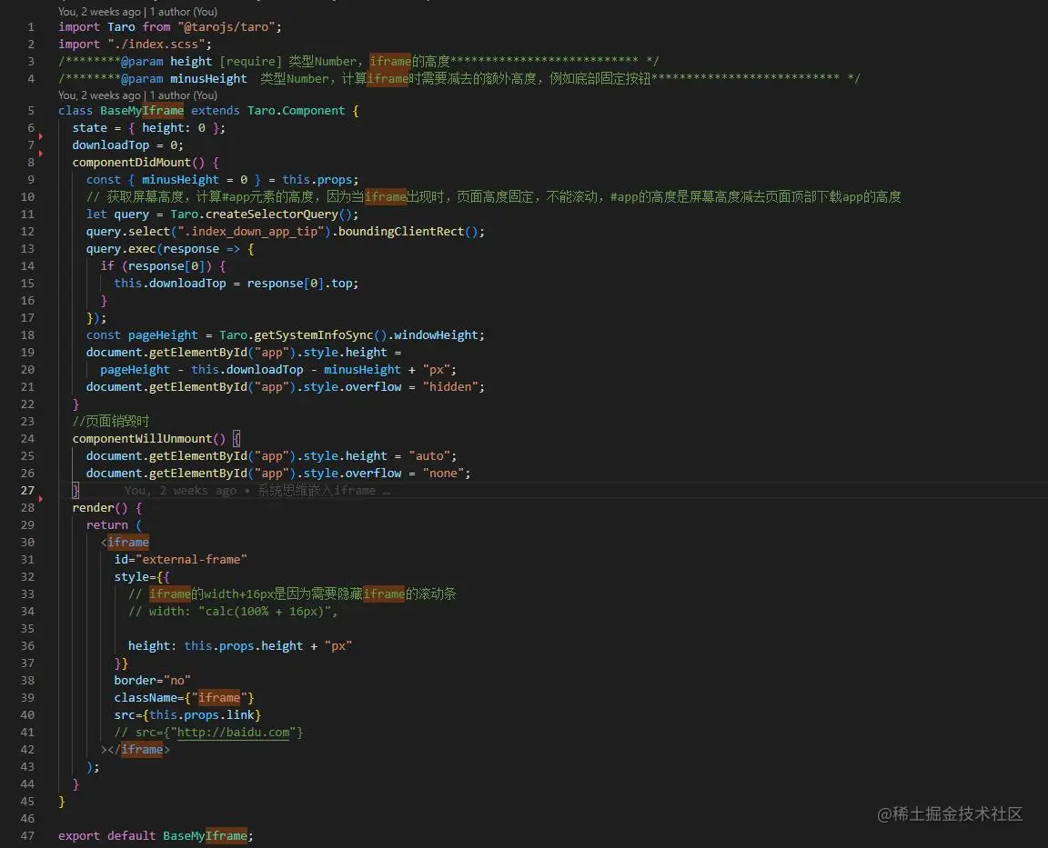 import Taro from "@tarojs/taro";import "./index.scss";/********@param height [require] 类型Number,iframe的高度*************************** *//********@param minusHeight 类型Number,计算iframe时需要减去的额外高度,例如底部固定按钮*************************** */class BaseMyIframe extends Taro.Component { state = { height: 0 }; downloadTop = 0; componentDidMount() { const { minusHeight = 0 } = this.props; // 获取屏幕高度,计算#app元素的高度,因为当iframe出现时,页面高度固定,不能滚动,#app的高度是屏幕高度减去页面顶部下载app的高度 let query = Taro.createSelectorQuery(); query.select(".index_down_app_tip").boundingClientRect(); query.exec(response => { if (response[0]) { this.downloadTop = response[0].top; } }); const pageHeight = Taro.getSystemInfoSync().windowHeight; document.getElementById("app").style.height = pageHeight - this.downloadTop - minusHeight + "px"; document.getElementById("app").style.overflow = "hidden"; } //页面销毁时 componentWillUnmount() { document.getElementById("app").style.height = "auto"; document.getElementById("app").style.overflow = "none"; } render() { return ( <iframe id="external-frame" style={{ // iframe的width+16px是因为需要隐藏iframe的滚动条 // width: "calc(100% + 16px)", height: this.props.height + "px" }} border="no" className={"iframe"} src={this.props.link} // src={"http://baidu.com"} ></iframe> ); }}export default BaseMyIframe;