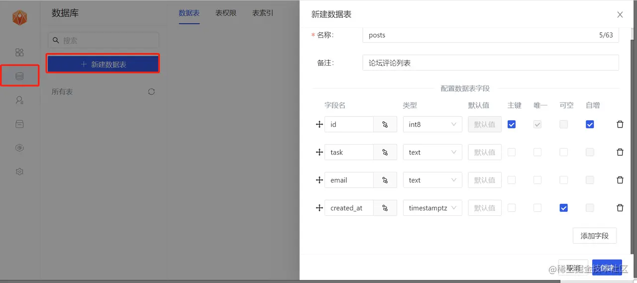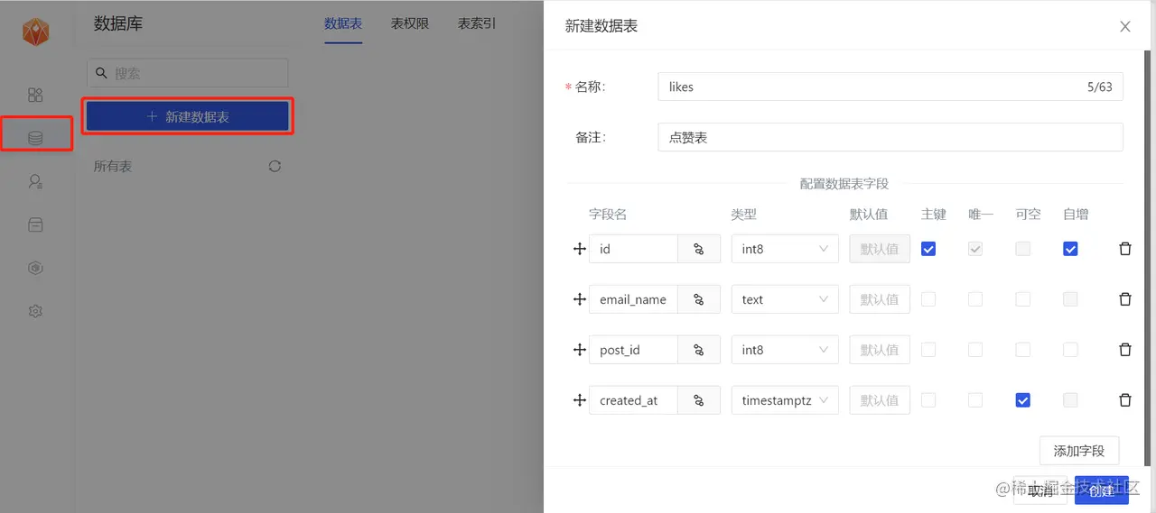 接下来我们需要创建数据表,posts表是用来存储用户论坛评论的数据,likes表用来存储用户点赞的某条评论的数据。