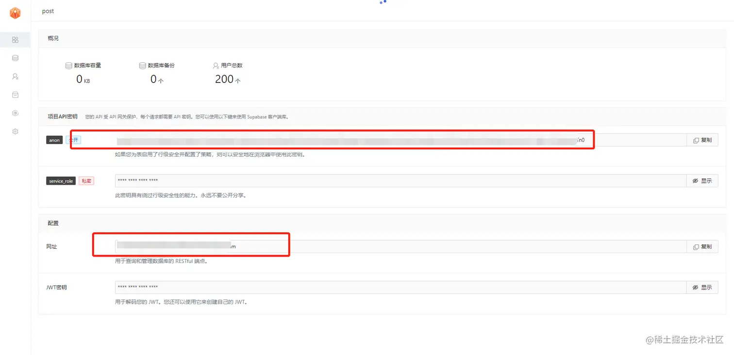 进入应用,我们在这里可以看到,Anon public是客户端API密钥。它允许“匿名访问”您的数据库,直到用户登录。登录后,密钥将切换到用户自己的登录令牌。这将为数据启用行级安全性。