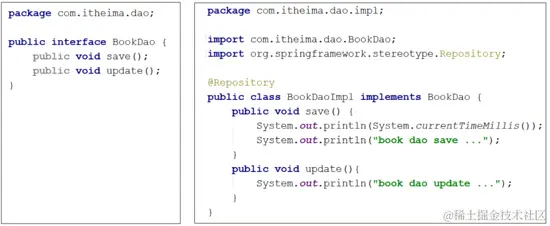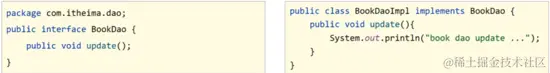 <pre class="prettyprint hljs java" style="padding: 0.5em; font-family: Menlo, Monaco, Consolas, "Courier New", monospace; color: rgb(68, 68, 68); border-radius: 4px; display: block; margin: 0px 0px 1.5em; font-size: 14px; line-height: 1.5em; word-break: break-all; overflow-wrap: break-word; white-space: pre; background-color: rgb(246, 246, 246); border: none; overflow-x: auto;">public interface BookDao { public void update(); public int select(); } @Repository public class BookDaoImpl implements BookDao { public void update(){ System.out.println("book dao update ..."); } public int select() { System.out.println("book dao select is running ..."); return 100; } }</pre> -
