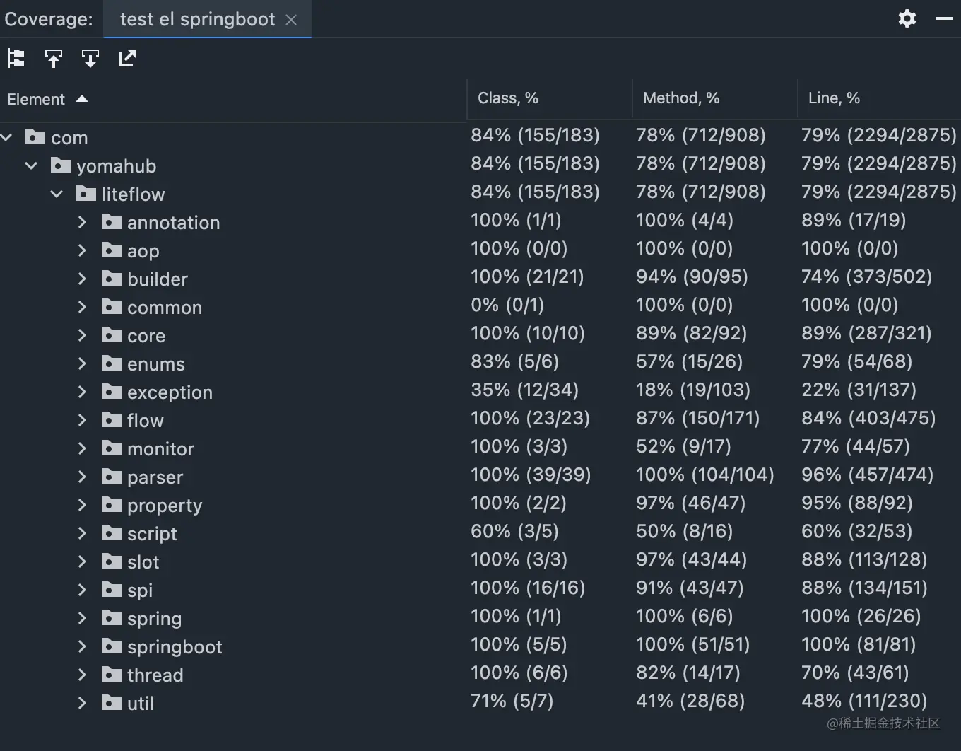 这里在最上面可以看到我整个测试用例的覆盖行数是79%。但这并不表示项目覆盖场景只有79%。行覆盖和功能场景覆盖是2个概念,这里只是表示所有的测试用例运行完,跑了所有代码行的比例。
